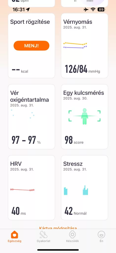 Lépésszámláló, Pulzusmérés, Vér oxigénszint, Alvásmonitorozás, Vérnyomás, Stresszszint figyelés, Légzésfigyelés