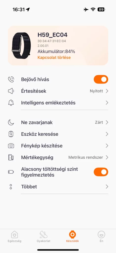 • Bejövő hívás jelzése, karkötő megtalálása